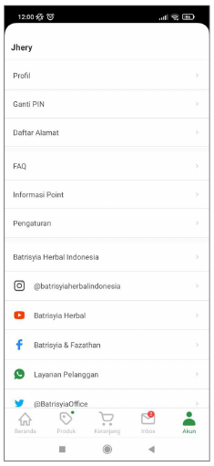 Halaman Akun memuat tentang data pribadi pemilik akun, informasi yang tersedia bersifat rahasia dan digunakan untuk kepentingan dalam kegiatan bertransaksi dan kegiatan elektronik lainnya dalam ruang lingkup penggunaan Aplikasi Batrisyia Store.