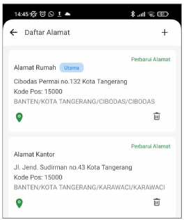 Halaman ini berisi informasi alamat pengguna yang saat ini aktif dan terdata di database pusat. Ada 2 alamat yang bisa digunakan, alamat utama dan alamat alternatif lainnya. Alamat utama digunakan sebagai acuan dalam pengiriman barang dan kedua alamat ini bisa diperbarui sewaktu-waktu sesuai kebutuhan.