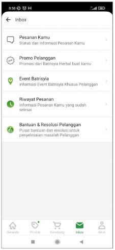 Halaman Inbox berisi Notifikasi pemberitahuan tentang Pesanan Kamu, informasi seputar Promo, Event Batrisyia, Riwayat Pesanan, serta Bantuan dan Resolusi.