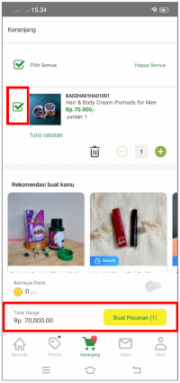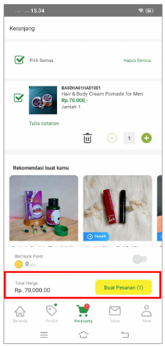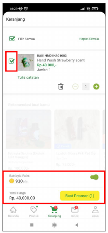 Untuk melakukan pembelian produk menggunakan Batrisyia Point, checklist terlebih dahulu produk yang akan dibeli, aktifkan tombol Point dengan menggeser slide button ke arah kanan, lalu tekan tombol “Buat Pesanan”.