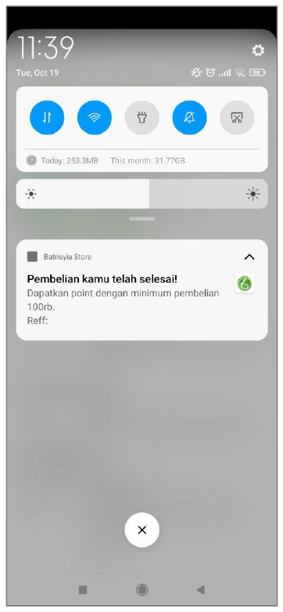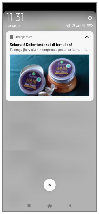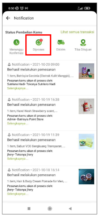 Selain pembeli dapat melakukan pengecekan status pada halaman keranjang, pembeli juga dapat melihat perubahan melalui notifikasi yang terkirim secara otomatis setiap adanya perubahan status pada proses transaksi. Setiap notifikasi yang muncul dilayar handphone, ketika di klik akan mengarah ke halaman notifikasi.