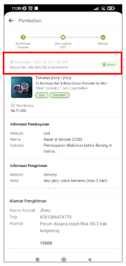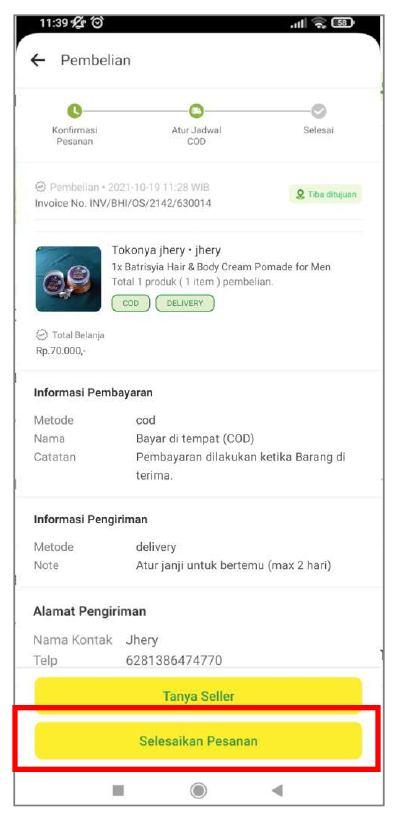 Setelah barang diterima, tekan tombol “Selesaikan Pesanan” untuk menyelesaikan proses transaksi.