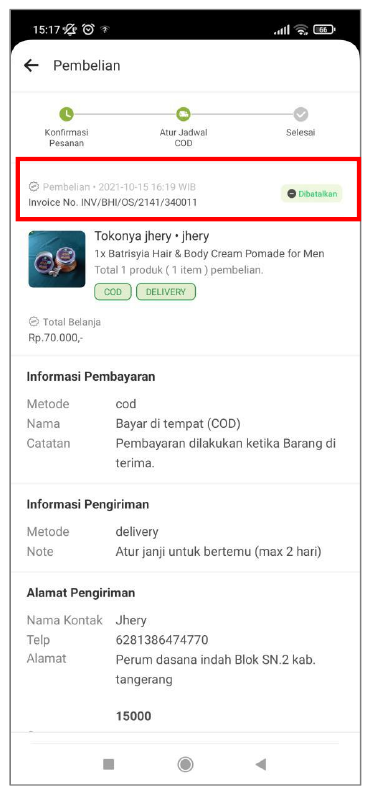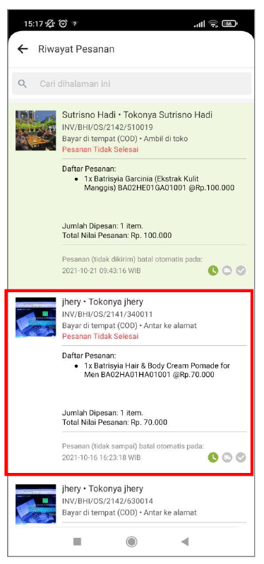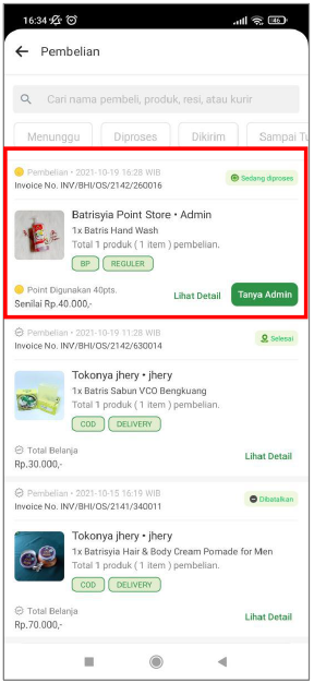 Keterangan status “dibatalkan” akan tampil jika pesanan tidak di konfirmasi oleh Seller setelah waktu konfirmasi berakhir, atau memang pihak Seller yang membatalkan. Selanjutnya status pesanan ini akan masuk ke dalam list Riwayat Pesanan.