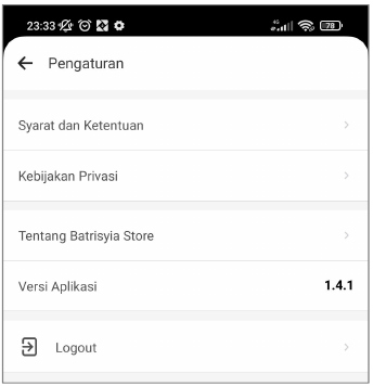 Berisi tentang Syarat dan Ketentuan, Kebiijakan Privasi, Tentang Batrisyia Store, Versi Aplikasi dan Logout