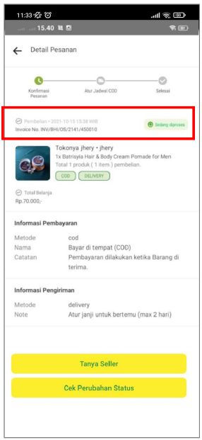 Terdapat panel informasi status yang berada diatas halaman detail pesanan, perubahan status akan berganti sesuai tahapan transaksi yang sedang berjalan.