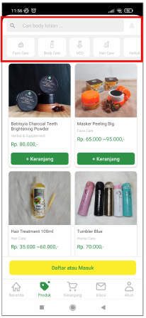 Pilih atau cari produk yang akan dibeli, lalu tambahkan ke dalam keranjang. Tekan tombol “+Keranjang” untuk menambahkan produk yang akan dibeli.