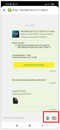 Komunikasi terbuka selama proses transaksi berjalan, pembeli dan penjual dapat mengirim pesan berupa text, foto dari kamera ponsel, atau kirim file lampiran. Jika proses transaksi sudah selesai, maka komunikasi antara penjual dengan pembeli akan masuk ke halaman Riwayat keranjang dan status chat hanya bisa dibaca.