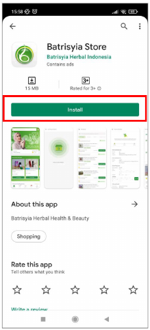 Setelah proses Download selesai, selanjutnya aplikasi akan terbuka dan menampilkan halaman tentang aplikasi, versi rilis dan tombol instalasi, tekan tombol “install” untuk melakukan proses instalasi Batrisyia Store.