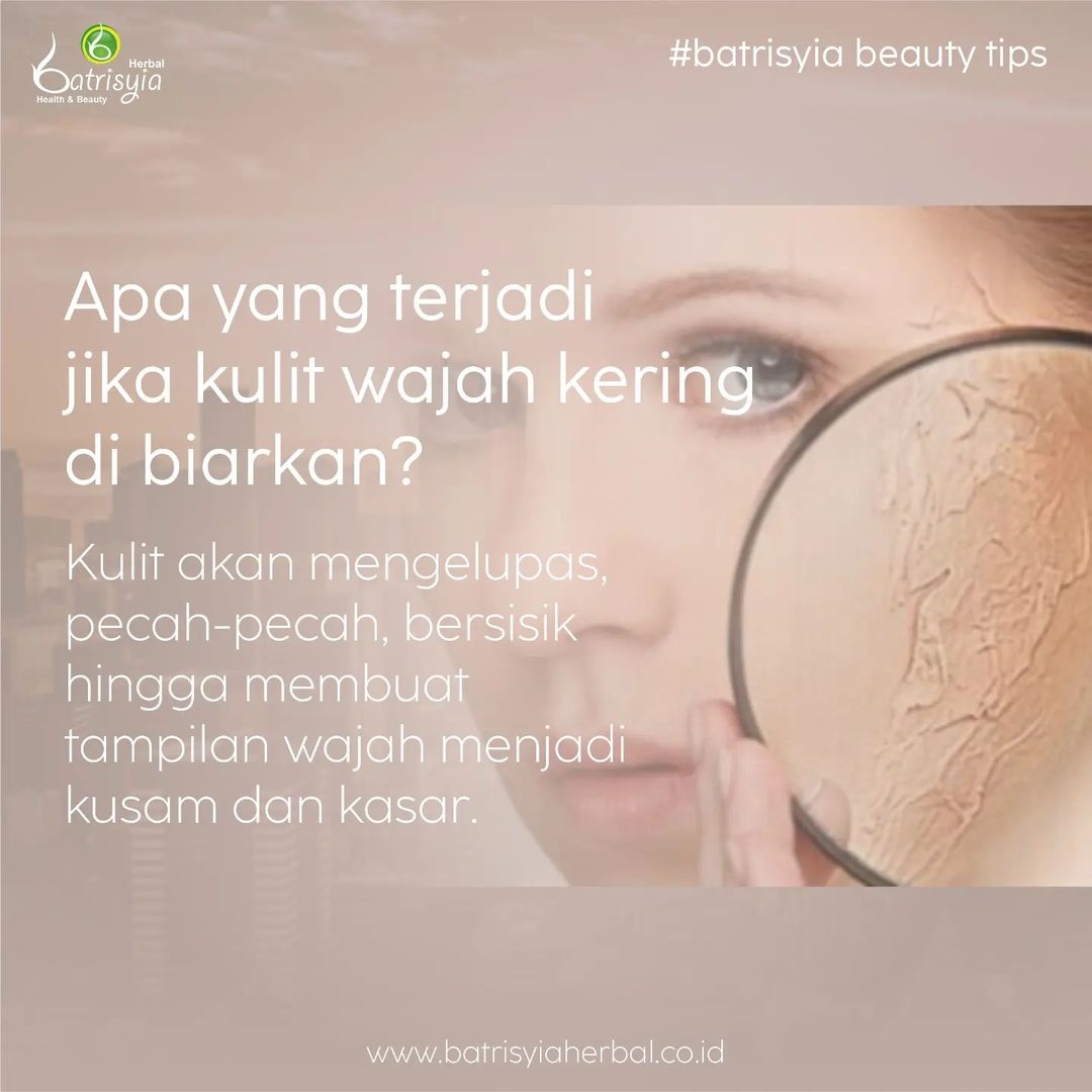 Dears, tahukah kamu? Jika kulit kering dibiarkan, lapisan kulit paling dalam akan menjadi terbuka, mengakibatkan kulit kotor karena polusi, lalu kulit kering yang dibiarkan bisa memicu infeksi lho. Bahkan jika ini tetap dibiarkan, maka bisa menjadi sarang bakteri dan timbul rasa gatal. Kulit kering yang dibiarkan sama saja menumpuk sel kulit mati, kulit akan terlihat kusam, menjadi semakin sensitif juga rentan mengalami penuaan dini. Jadi, masih mau membiarkan kulit tetap kering? Oh tentu saja tidak!! Solusinya adalah dengan rajin minum air putih juga rutin menggunakan perawatan kulit wajah, seperti dari Batrisyia Herbal.