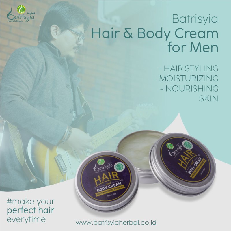 Batrisyia Hair & Body Cream for Men Cream ini selain menjadikan rambut lebih rapih dan tampak basah berkilau juga untuk menutrisi rambut dan kulit sehingga menjadikannya sehat, terlindungi dari efek buruk sinar matahari, juga dapat membantu melembapkan kulit tangan dan tubuh. Caranya: Ambil Batrisyia Hair & Body Cream secukupnya dan ratakan keseluruh rambut sehingga rambut terlihat teratur. Pada kulit, oleskan krim pada siku, lutut, atau kulit yang terasa kering, dan biarkan krim meresap.
