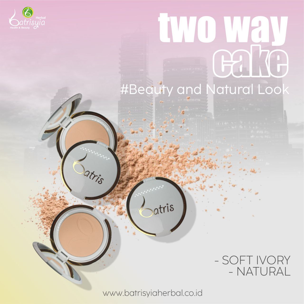 Batrisyia Two Way Cake tidak hanya untuk menyamarkan kekurangan pada wajah saja lho, karena memiliki kandungan skincare di dalamnya seperti VCO dan Vitamin E juga memiliki tekstur yang lembut dan tidak menutup pori-pori wajah sehingga mencegah timbulnya jerawat dan tidak membuat kulit menjadi kering.