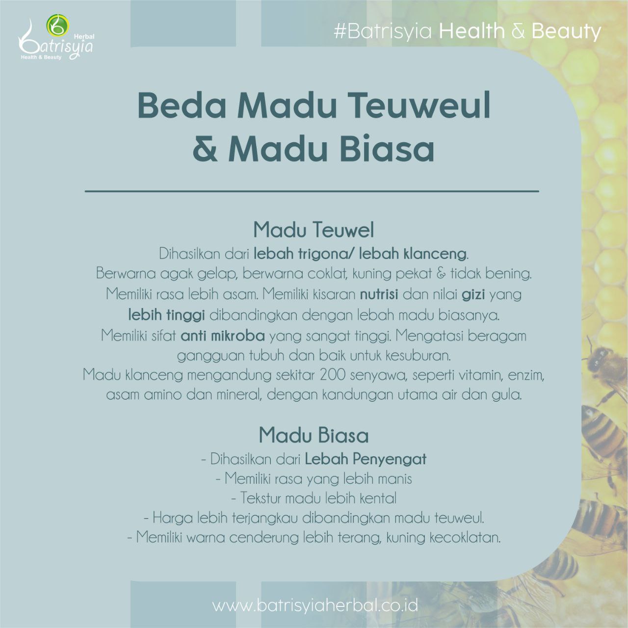 Hai hai...siapa nih yang masih sering bingung membedakan madu teuweul dan madu biasa? Kali ini ada info menarik tentang perbedaan kedua madu tersebut nih, Batrisyia lovers. Ternyata, dari lebah penghasilnya, hingga warna dan tekstur madu teuweul dan madu biasa ini ada perbedaannya, lho. Semoga info singkat ini bisa menambah pengetahuan kita yaa... ❤️💕