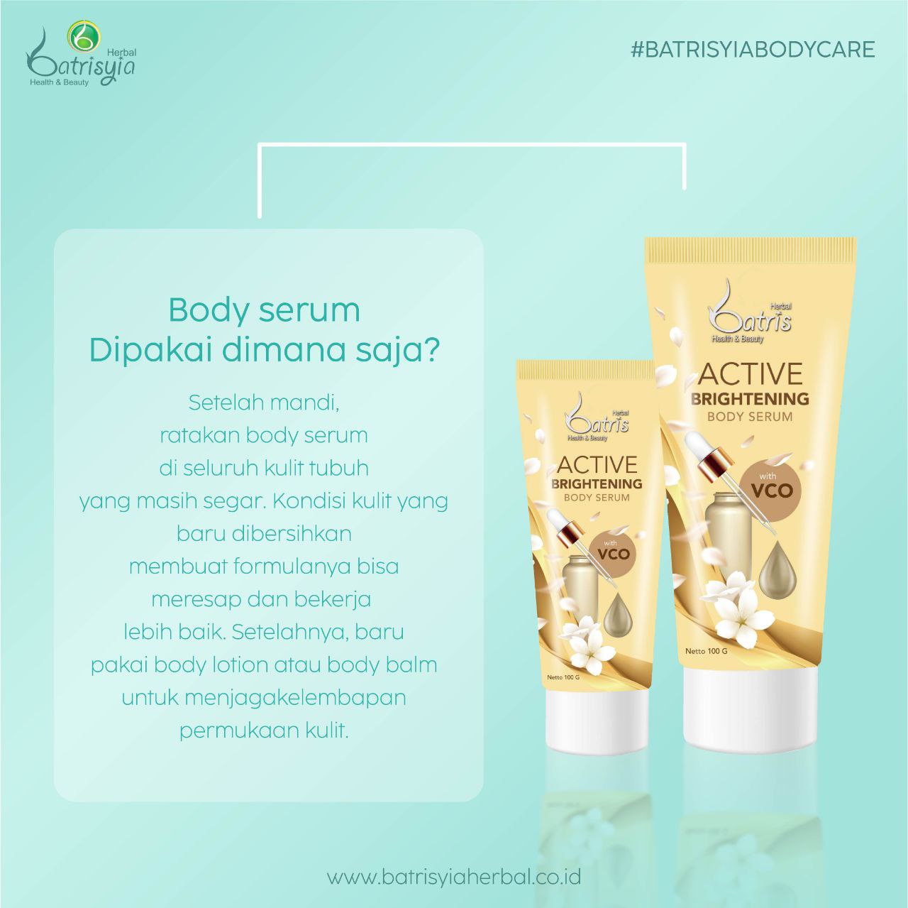 Dears, jika ingin mendapatkan hasil yang optimal pada pemakaian Batrisyia Body Serum, kalian harus mengoleskannya secara merata pada seluruh bagian tubuh, terutama bagian-bagian yang rentan kering seperti siku dan lutut. Karena kulit pada bagian tubuh yang tidak pernah terpapar body serum rentan mengalami perubahan warna menjadi kusam, mengendur, atau kering.