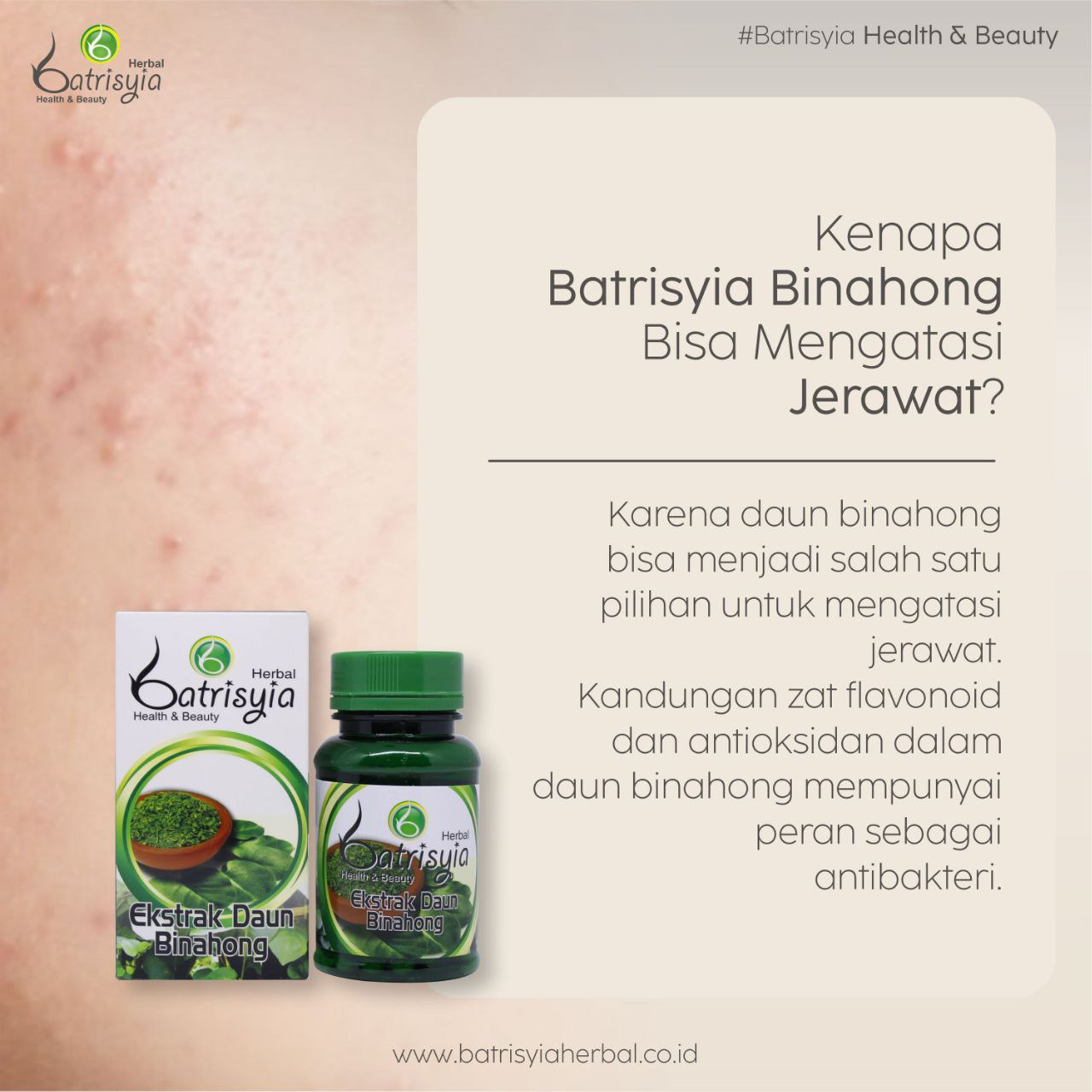 Ladies, nyatanya jerawat bisa diatasi dengan Batrisyia Kapsul Binahong lho. Karena senyawa tinggi flavonoid pada daun binahong mampu mengurangi produksi minyak dan mengecilkan pori-pori wajah.