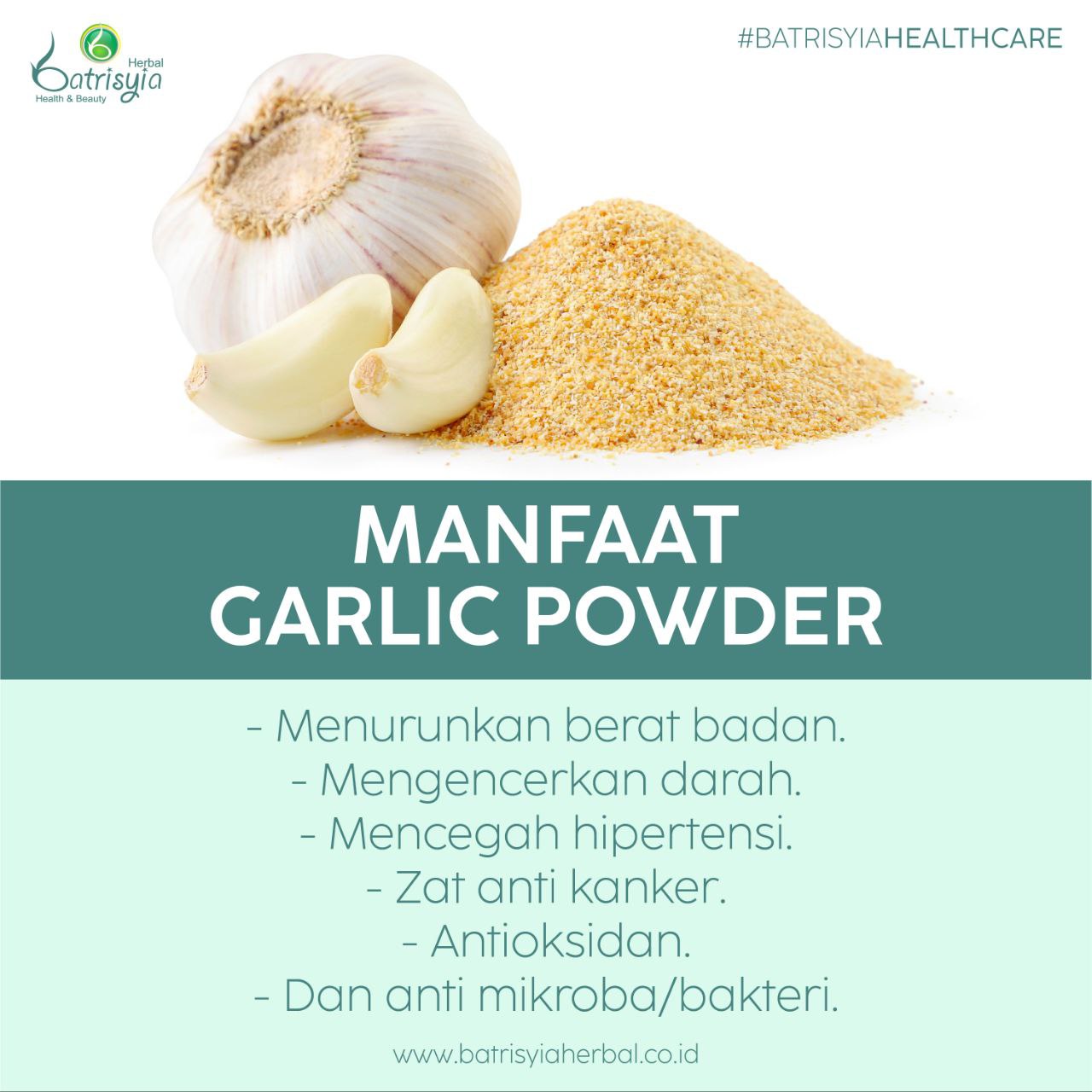 Nah itulah beberapa manfaat garlic powder bagi kesehatan manusia. Semoga info singkat ini bisa bermanfaat. Dan kalian juga bisa mendapatkan manfaat garlic powder pada Batrisyia Herbal Powder