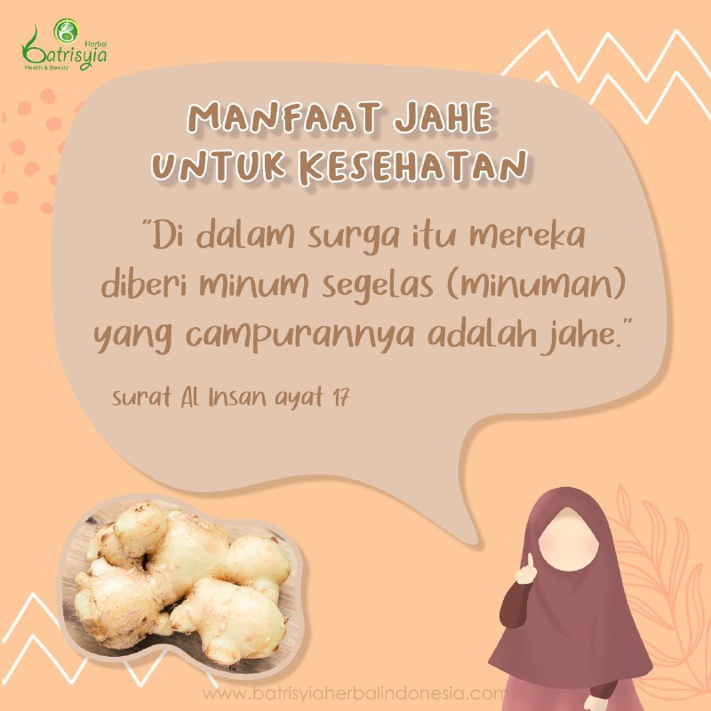 Selama masa pandemi COVID-19, kepopuleran jahe pun meningkat. Karena kandungan antioksidannya, jahe disebut-sebut dapat melawan corona, seperti polifenol yang dapat meningkatkan sistem imun tubuh. Dalam Al-Qur'an jahe bahkan tercatat sebagai bahan minuman surga. Manfaat lain jahe untuk kesehatan adalah: Mengatasi masalah pencernaan Mengurangi mual Mengurangi rasa sakit Membantu proses detoksifikasi dan mencegah penyakit kulit Melindungi Anda dari kanker Anti peradangan Batrisyia Herbal pun memiliki minuman kesehatan yang terbuat dari jahe lho, yaitu Wedang Jahe, kalian sudah tahu belum?