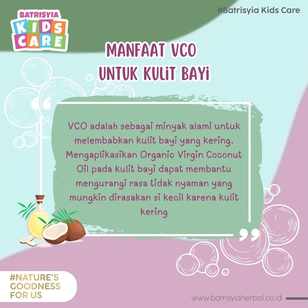 VCO adalah sebagai minyak alami untuk melembabkan kulit bayi yang kering. Mengaplikasikan Organic Virgin Coconut Oil pada kulit bayi dapat membantu mengurangi rasa tidak nyaman yang mungkin dirasakan si Kecil karena kulit kering.