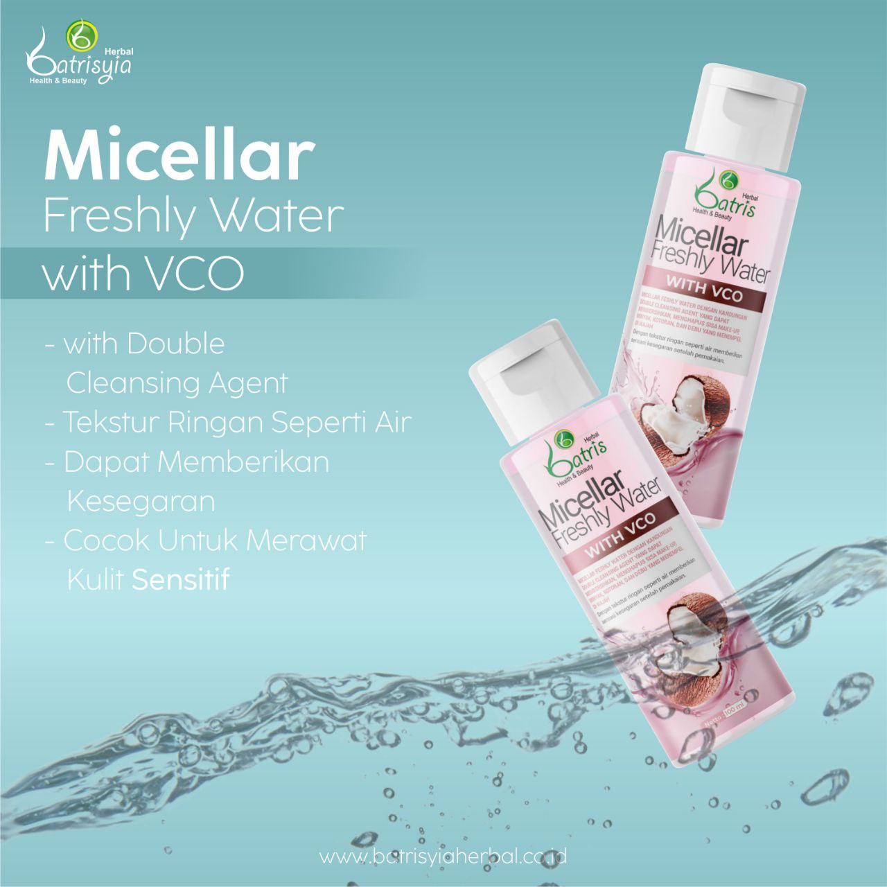 Micellar Freshly Water with VCO dengan kandungan Double Cleansing Agent yang memiliki tekstur yang ringan seperti air serta dapat memberikan sensasi kesegaran setelah pemakaian. Sangat cocok digunakan untuk kulit kering hingga kulit sensitif.