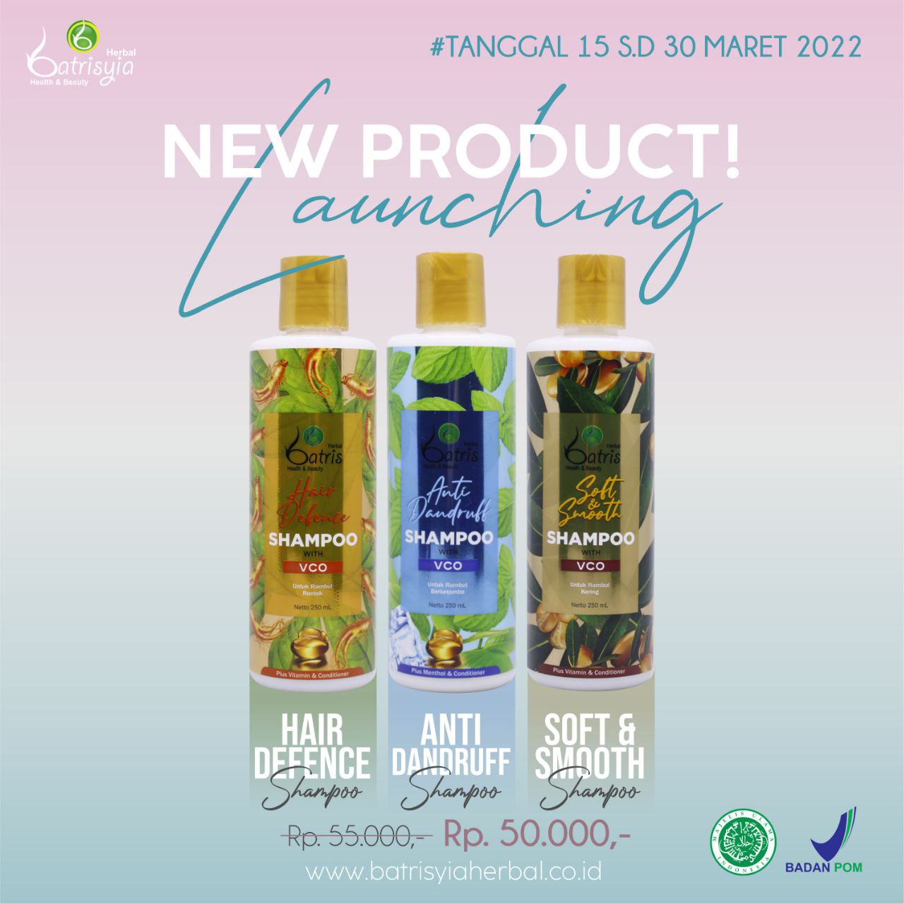 Batrisyia Lovers yuk kenalin dengan produk hair care terbaru dari Batrisyia Herbal, yaitu: Soft & Smooth Shampoo with VCO Shampoo yang dapat merawat kondisi rambut yang rusak seperti kering, kusam, bercabang, dan mudah patah sehingga menambah kelembutan tekstur rambut serta membuat rambut mudah untuk diatur dan tampak indah. Hair Defence Shampoo with VCO Shampoo dengan kandungan Panax Ginseng Root Extract, Panthenol (Vit. B5), Hair Conditioning, dan VCO yang dapat merawat dan menguatkan akar rambut yang rontok sehingga dapat mengurangi kerontokan rambut. Anti Dandruff Shampoo with VCO Shampoo dengan kandungan Tea Tree Oil, Piroctone Olamine, Hair Conditioning, dan VCO yang dapat mengurangi ketombe dan rasa gatal akibat ketombe. Mengandung Menthol yang dapat memberikan sensasi dingin di kulit kepala.