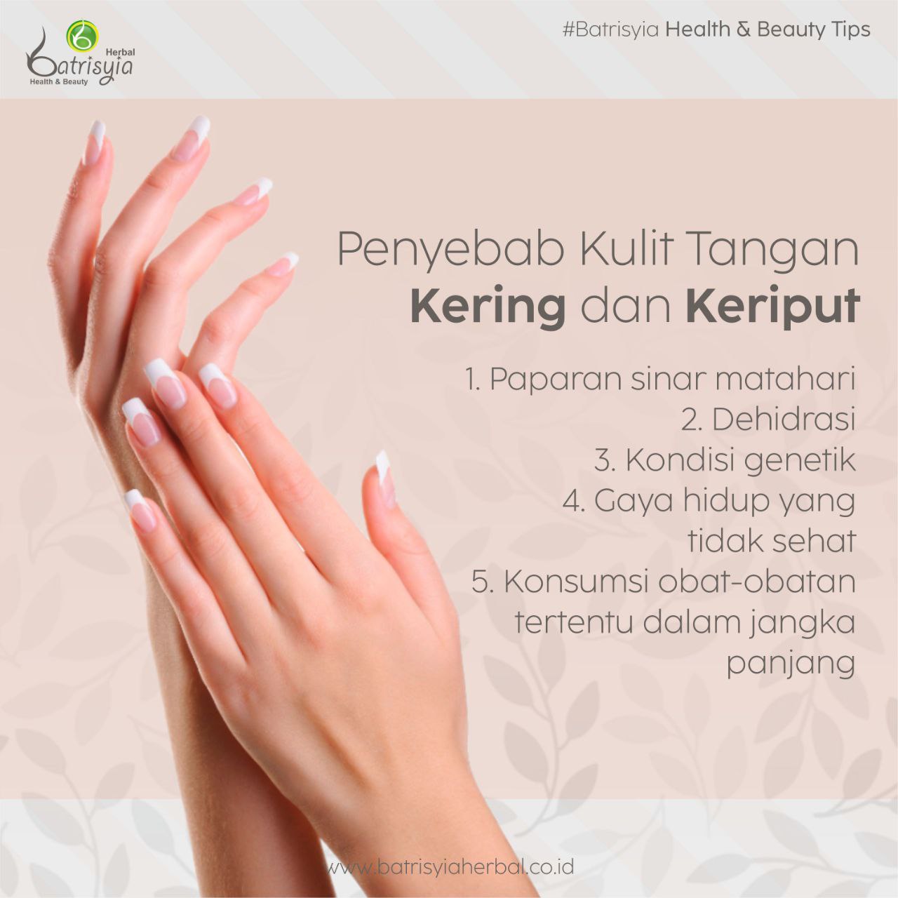 Batrisyia Lovers, nyatanya faktor-faktor ini tidak hanya membuat kulit wajah yang menjadi kering dan mudah keriput tetapi juga bisa menyebabkan pada kulit tubuh salah satunya adalah tangan.