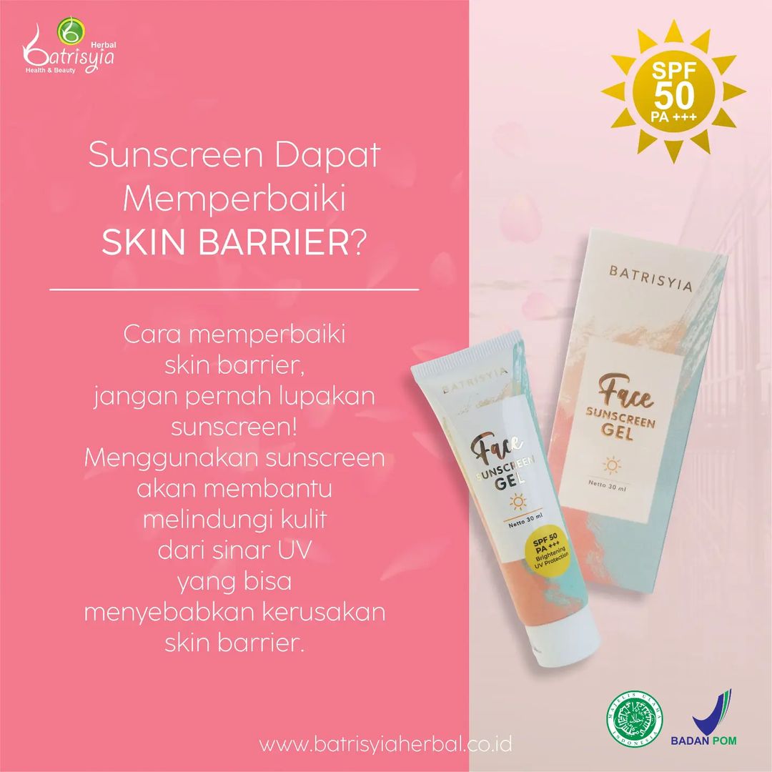 Batrisyia Lovers, siapa diantara kalian yang mengalami rusaknya skin barrier? Sebelum bertambah parah, yuk segera atasi sekarang juga! Salah satu cara untuk memperbaiki skin barrier yang rusak ialah dengan rutin menggunakan sunscreen. Namun, saat memilih sunscreen pun harus tetap berhati-hati, pastikan menggunakan sunscreen yang mengandung bahan yang aman, seperti halnya Batrisyia Sunscreen Gel. Sunscreen dengan SPF 50 PA+++ yang diperkaya dengan ekstrak lidah buaya dan vitamin B3. Sunscreen ini juga sangat cocok digunakan sehari-hari maupun pada saat kamu banyak melakukan aktivitas diluar ruangan. Buat kamu yang penasaran dan mau order, bisa melalui aplikasi Batrisyia Store!!