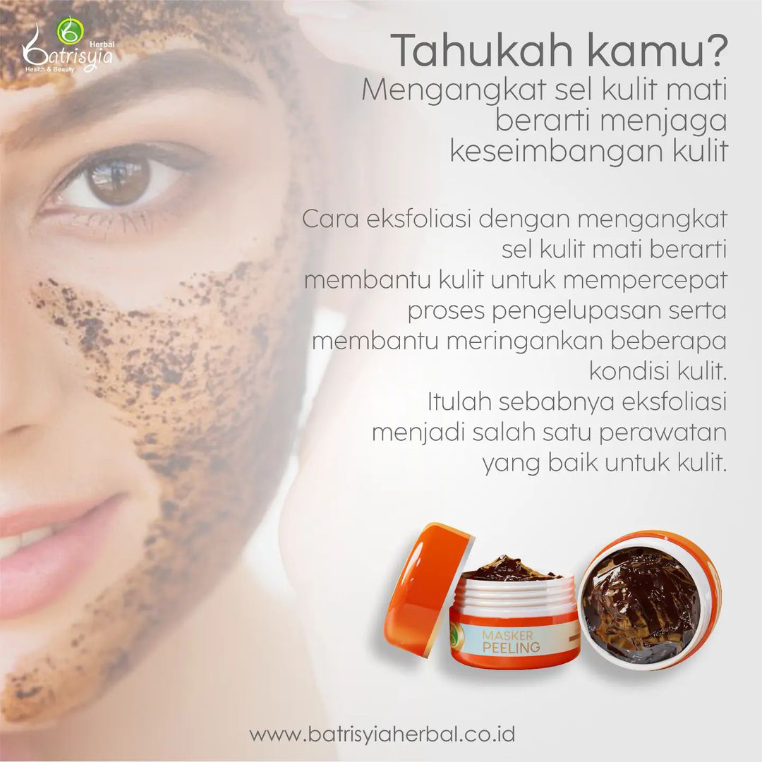 Cara untuk mendapatkan manfaat eksfoliasi, yaitu dengan produk dari Batrisyia Masker Peeling, selain bisa mempercepat proses pengelupasan sel kulit mati, juga menjadikan kulit lebih halus, bebas kusam, bebas noda hitam dan melembapkan.