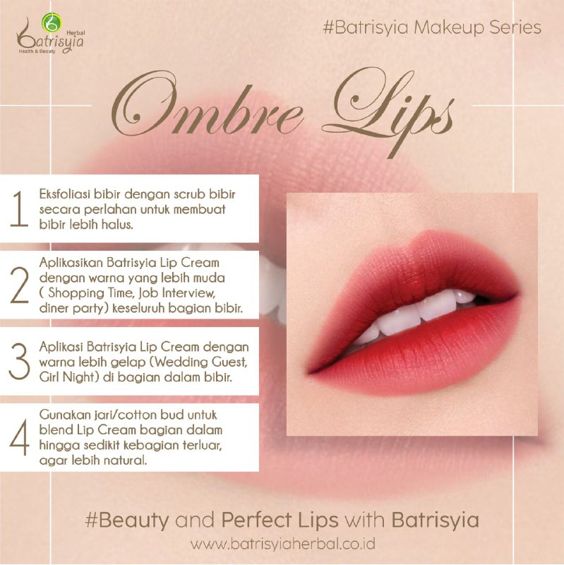 Langkah-Langkah Membuat Ombre Lips With Batrisyia Lip Cream. Gradasi warna lipstik yang berbeda di bibir yang membuat bibir kamu nampak beda ini sedang menjadi tren dan banyak digemari para wanita. Untuk membuat warna ombre, kamu harus memiliki dua warna lipstik. Lipstik pertama berwarna terang sedangkan warna lipstik yang kedua harus kebalikan dari gradasi warna lipstik pertama, namun jika kamu ingin menggunakan lebih dari dua warna dibolehkan. Nah, berikut tutorial dengan menggunakan Matte Lip Cream Batrisyia, yang mudah dan anti gagal. Selamat mencoba ya
